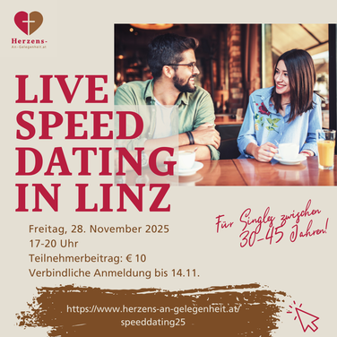 Melde dich (Formular unten) hier zu unserem nächsten christlichen LIVE Speeddating in Linz an. (Gerne auch deinen Singlefreunden weitersagen!)